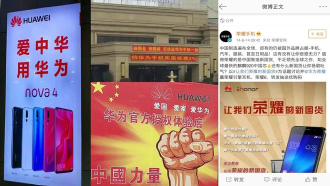 “爱中国,用华为!”,“爱国行动”,“让我们荣耀的新国货”!这些是什么呢?可能有人会说了,这又不是华为提倡的,是他们自发的,跟华为有什么关系?